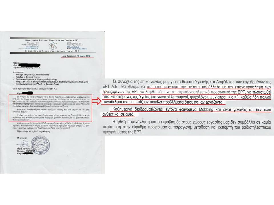 Στην προσπάθειά τους να παρουσιάσουν μια “δραματική εικόνα της πραγματικότητας”, δεν δίστασαν να ζητήσουν απο τη διοίκηση της νέας ΕΡΤ να φέρει ψυχολόγους και ψυχιάτρους προκειμένου να παράσχουν τουλάχιστον τις πρώτες βοήθειες στους εργαζόμενους,θύματα του mobbing, που περιφέρονται …τρομοκρατημένοι και …ψυχολογικά ράκη στους διαδρόμους του ραδιομεγάρου.